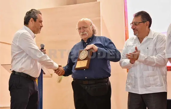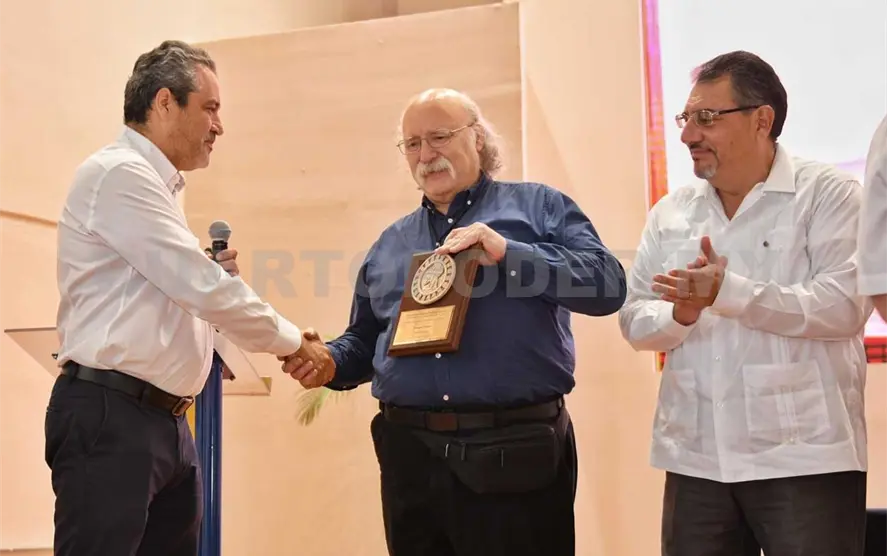 Posteriormente, el rector Carlos Faustino Natarén Nandayapa le entregó un reconocimiento y destacó la importancia de que personalidades como el Premio Nobel puedan interactuar con la comunidad universitaria.