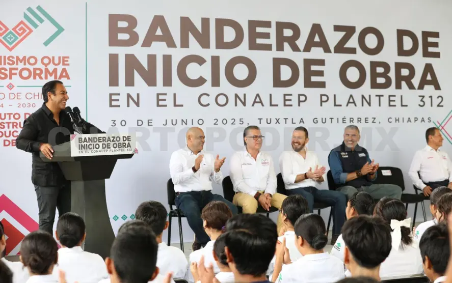 Durante el banderazo del inicio de obras de infraestructura educativa en el Colegio Nacional de Educación Profesional Técnica (Conalep) Plantel 312 de Tuxtla Gutiérrez, el gobernador Eduardo Ramírez Aguilar reafirmó su compromiso con la ampliación de espacios escolares y la dotación de herramientas tecnológicas que garanticen una mejor preparación académica para la juventud chiapaneca.