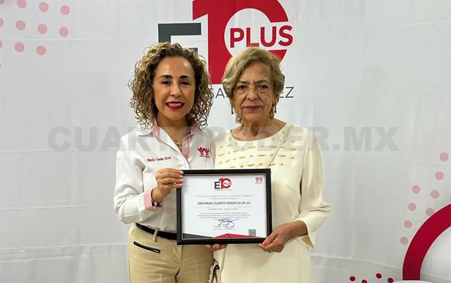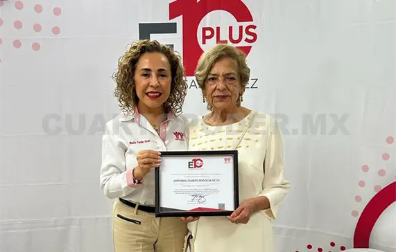 La maestra María Morales Ruiz, directora general y editora responsable del periódico Cuarto Poder, recibió este miércoles el reconocimiento del programa Empresas de Diez Plus, que es otorgado por el Instituto del Fondo Nacional de la Vivienda para los Trabajadores (Infonavit), con el objetivo de impulsar y reconocer a las y los empleadores que favorecen el desarrollo económico del país