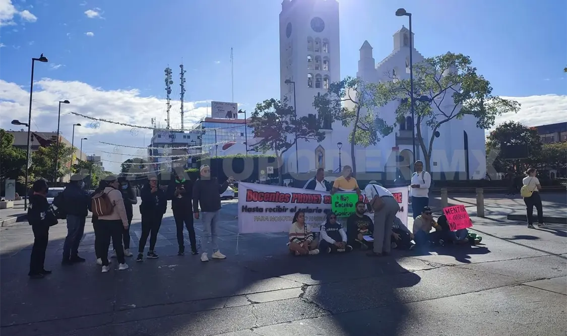 Docentes denunciaron la falta de pago de sus salarios, colocando una lona de protesta y cerrando las vialidades del cruce de calle y avenida Central, frente a la catedral de San Marcos, en la capital del estado.