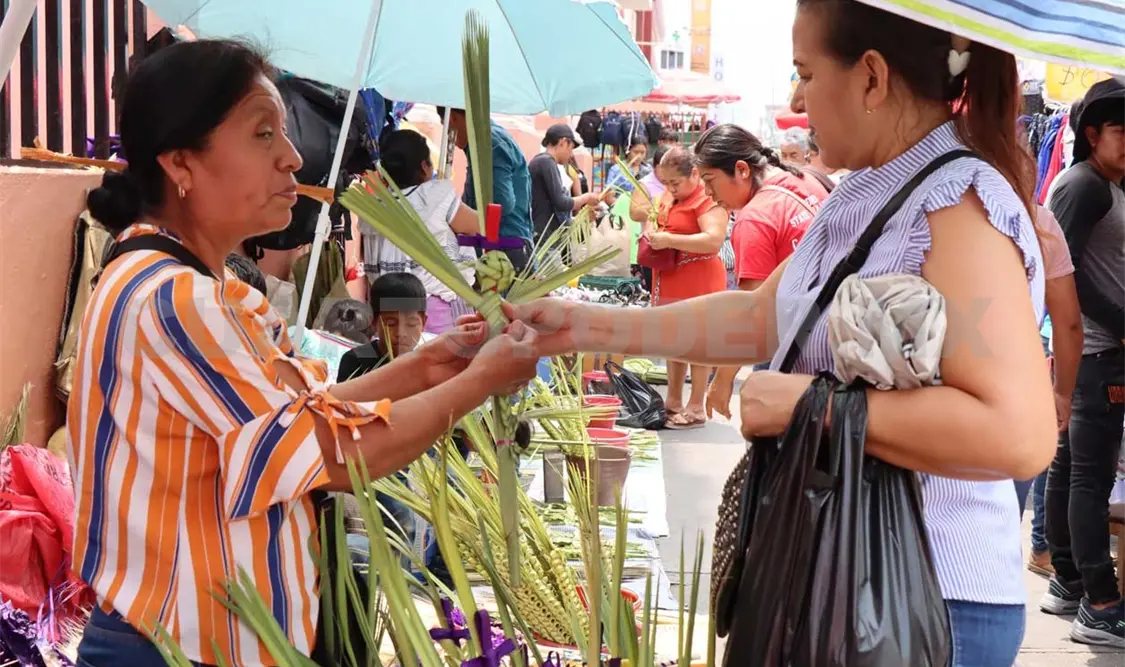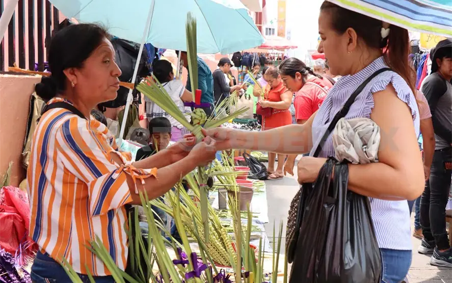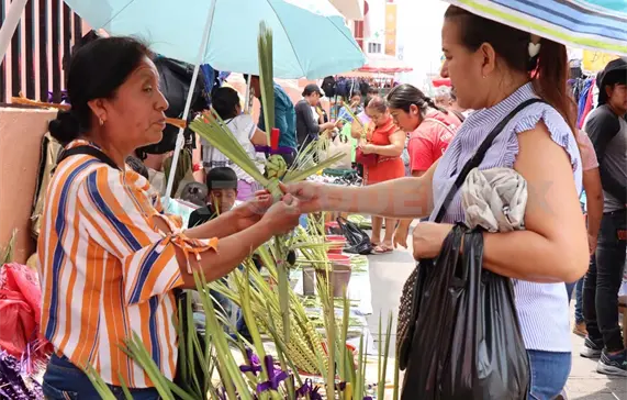 A costos muy accesibles que rondan los 20 pesos, artesanos y artesanas de Aguacatenango y Venustiano Carranza ofertan en Tuxtla Gutiérrez las características palmas que se portan al iniciar la Semana Santa durante el Domingo de Ramos.