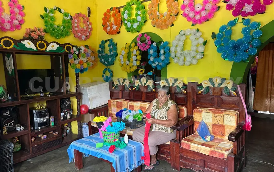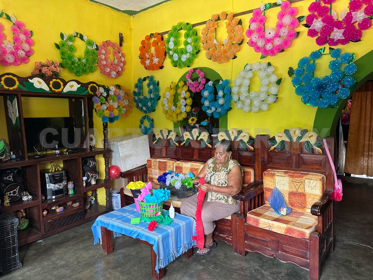 “Preparo flores y arreglos para esta ocasión, esto lo aprendí con mi suegra y la señora María, esposa de don Juan Siu, allí llegaba yo para ayudarles y así fui aprendiendo, ahora ya me ayudan mis hijas, nietas, hasta que realizamos varias coronas de diferentes tamaños, la mayoría son ya encargos que desde un inicio me han sido de ayuda económica”, expresó doña Tere.