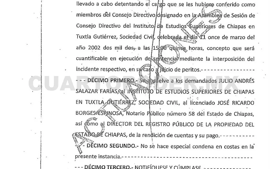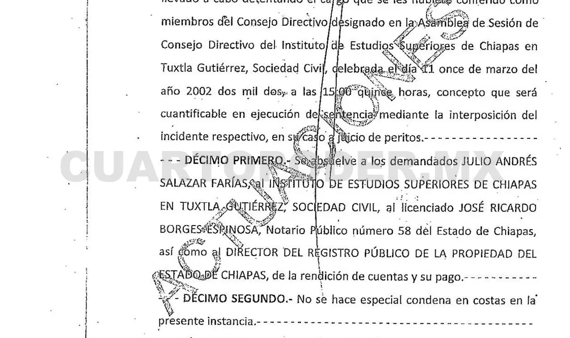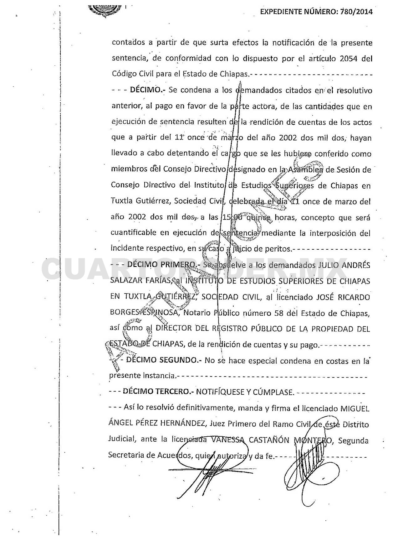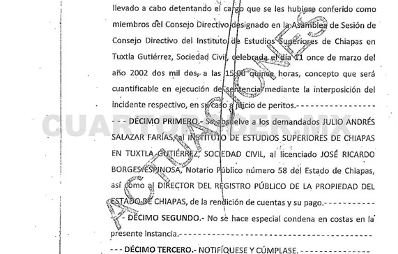 El Juzgado Primero del ramo civil del distrito judicial de Tuxtla Gutiérrez emitió una sentencia definitiva en contra del empresario del ramo educativo y político chiapaneco, Emilio Enrique Salazar Farías, y contra tres personas más, y le dio la razón total a su primo hermano Federico Luis Salazar Farías ,quien había sido removido de manera ilegal del cargo de presidente del Consejo Directivo del Instituto de Estudios Superiores de Chiapas.