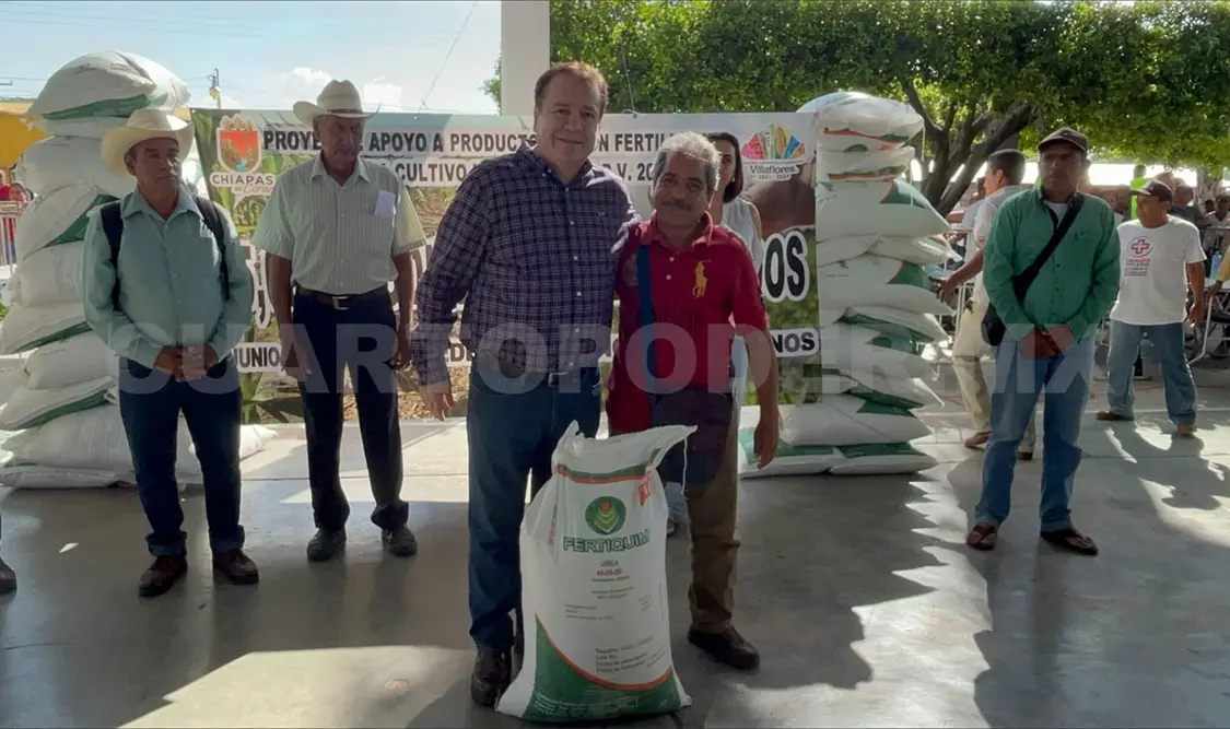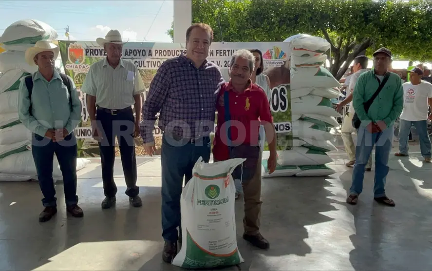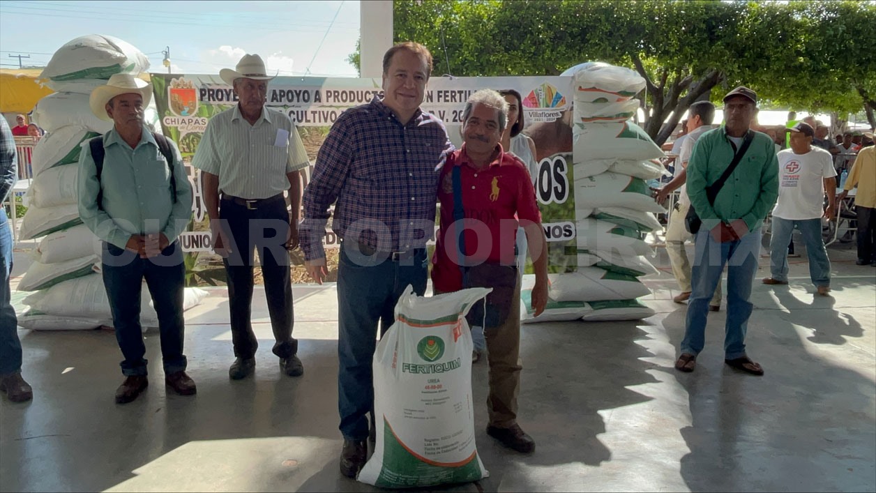 En el ejido Agrónomos Mexicanos, el alcalde Mariano Rosales, en nombre del ayuntamiento que encabeza, dio inicio a la entrega de fertilizante urea para 15 mil productores de todo el municipio de Villaflores.