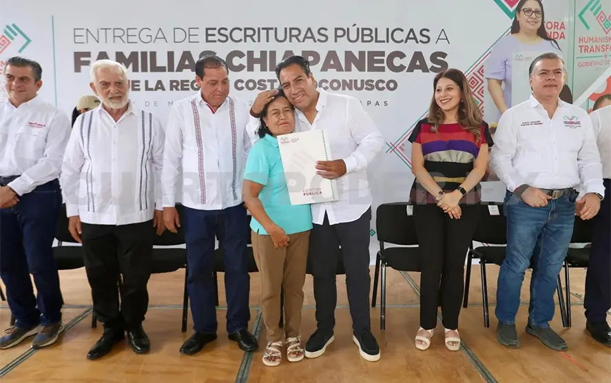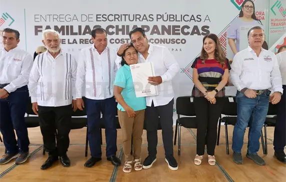 En Huixtla, el gobernador Eduardo Ramírez Aguilar encabezó la entrega de escrituras públicas a familias chiapanecas de la Costa-Soconusco, donde aseguró que su administración trabaja en coordinación con el Gobierno Federal para detonar el desarrollo de esta región, muestra de ello son proyectos estratégicos como la Línea K del Tren Interoceánico y el parque lineal que se construye en este municipio.