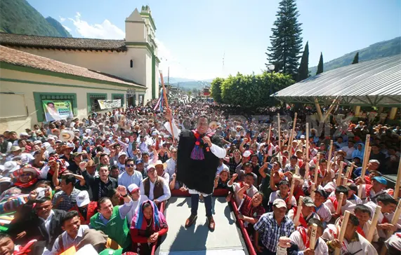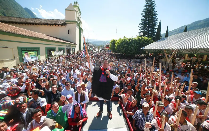 Gritos a unísono de “Eduardo” reciben al precandidato único de la coalición Seguiremos haciendo historia en Chiapas, Eduardo Ramírez Aguilar, en los municipios de Chenalhó y San Cristóbal de Las Casas.