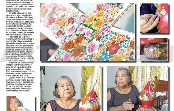En este escenario, presentamos a la prestigiada Guadalupe Pérez Sánchez, artesana del pueblo mágico de Chiapa de Corzo, que con su técnica y estilo ha decorado piezas y obras únicas con laca y pigmentos naturales sobre madera, vasijas, cofres, jicalpextles, cruces y muchas más.