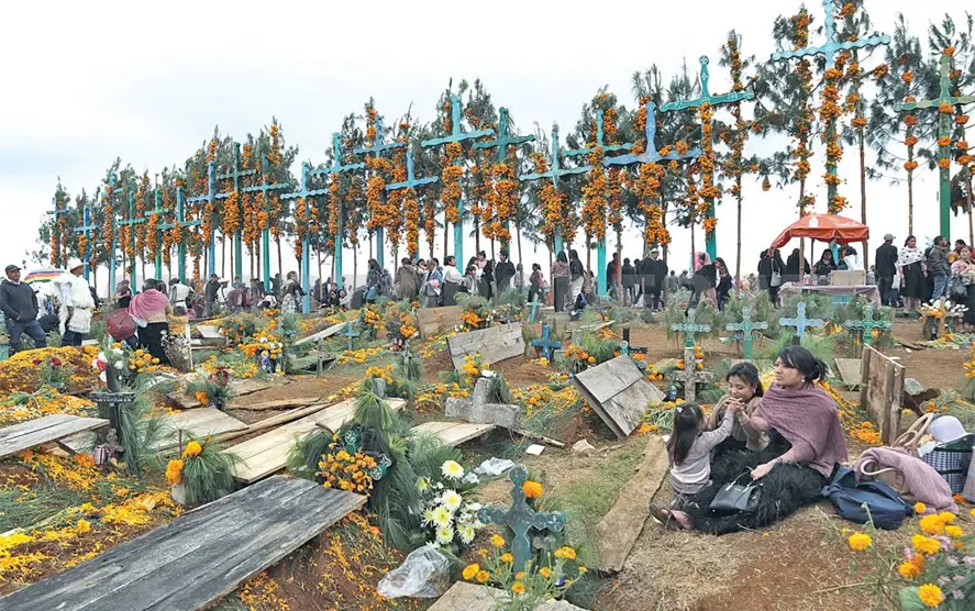 Desde el primero de noviembre, familias indígenas arriban a decorar las tumbas de sus difuntos, donde, según la creencia tsotsil, las almas llegan caminando para disfrutar las ofrendas que les han dejado.