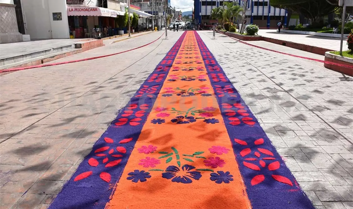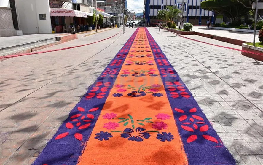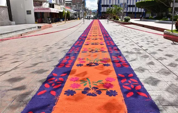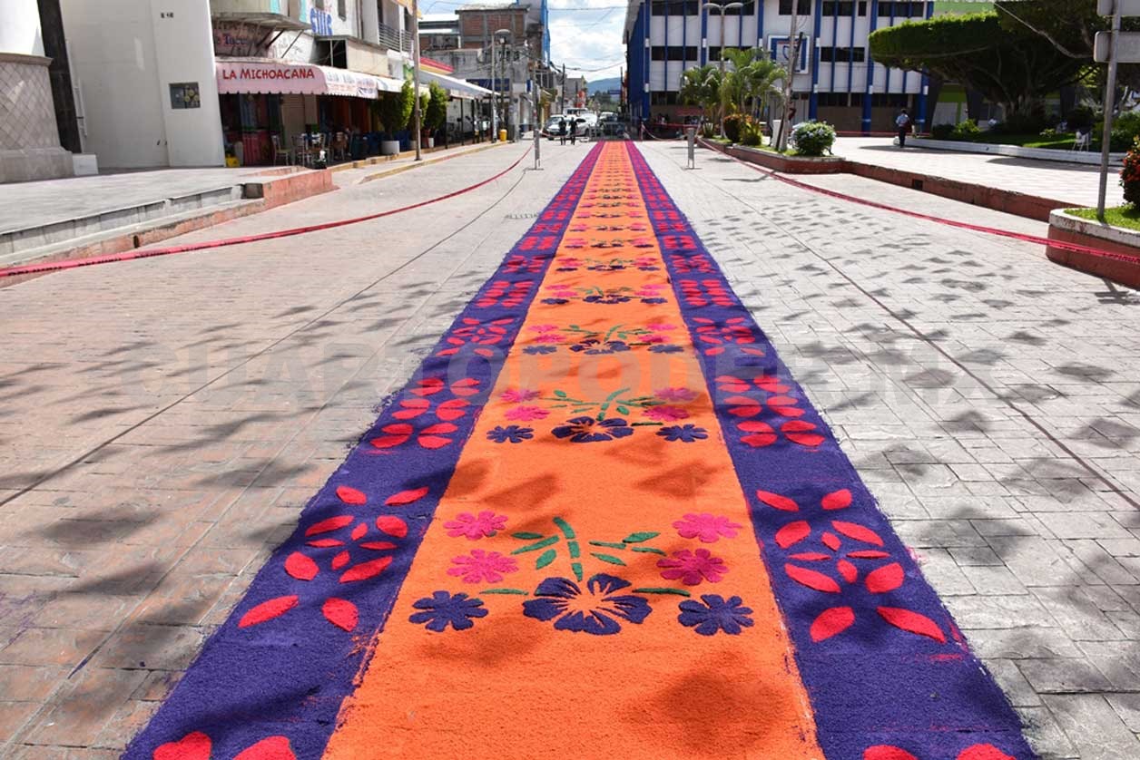 Para la procesión en honor al Señor de Esquipulas, con la que arrancó formalmente la Expo Feria Villaflores 2016, artesanos realizaron una alfombra de 150 metros, hecha de aserrín con figuras de flores multicolores, frente a la catedral y la 1ª avenida sur y 1ª oriente.