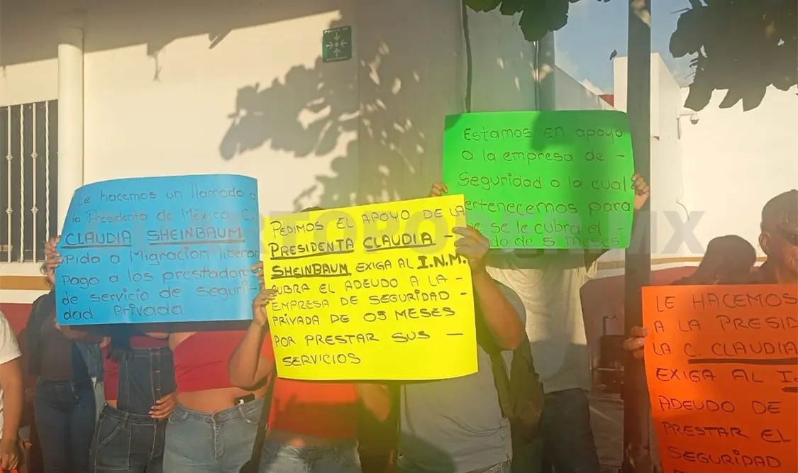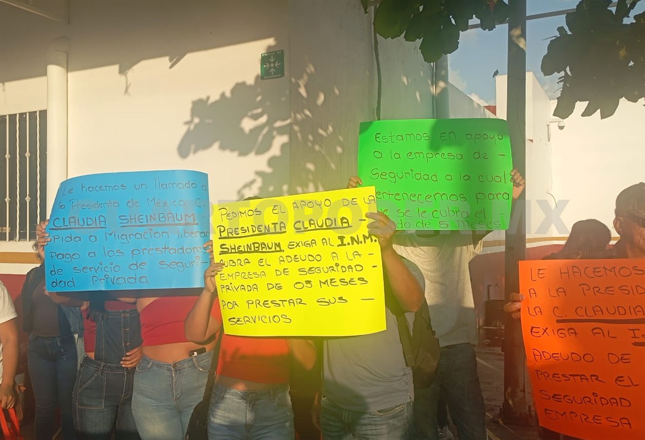 Ante la falta de pago de cinco meses de adeudos por los servicios prestados, elementos de seguridad privada realizaron la tarde de este viernes una manifestación ante las oficinas de la Estación Migratoria Siglo XXI del Instituto Nacional de Migración (INM) en Tapachula.
