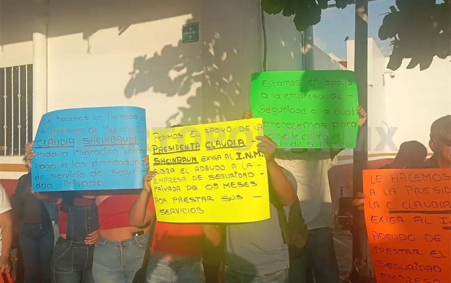 Con pancartas, los manifestantes, entre mujeres y hombres, algunos de ellos acompañados de sus familias, pidieron la intervención directa de la presidenta Claudia Sheinbaum Pardo, para que el INM cubra el adeudo a la empresa para la que trabajan.