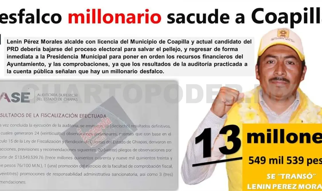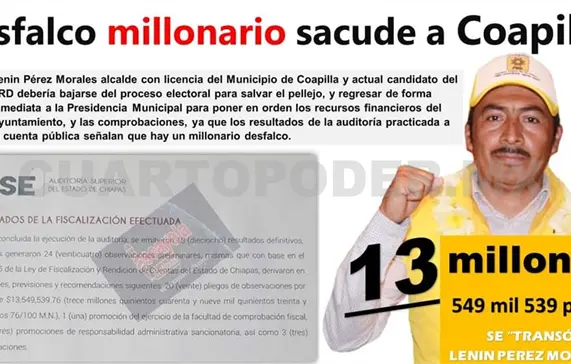 Esta reveló que la captación, uso, aplicación y destino de los recursos públicos, así como los actos y operaciones realizados en Coapilla por la administración de Lenin Pérez Morales no se ajustó a las disposiciones legales y normativas aplicables.