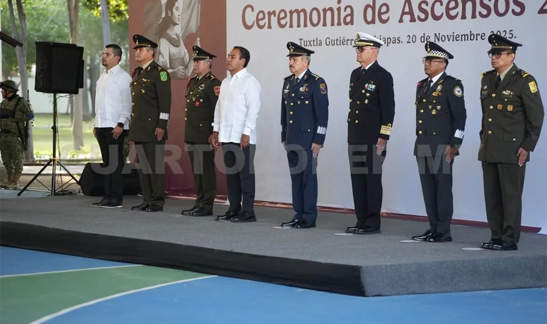 El titular de la Secretaría de Seguridad del Pueblo (SSP), Óscar Alberto Aparicio Avendaño, asistió a la Ceremonia de Ascensos 2025, encabezada por el general de División del Estado Mayor Edgar Salvador Rodríguez Franco, comandante de la Región Aérea Militar Sureste, con la presencia del gobernador Eduardo Ramírez Aguilar.