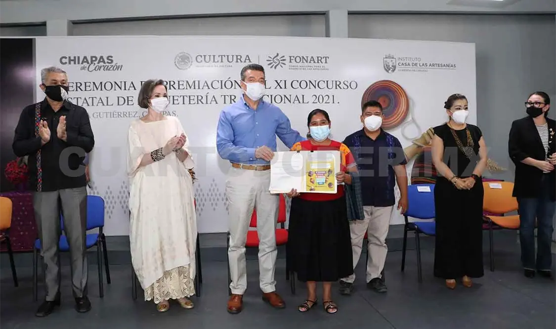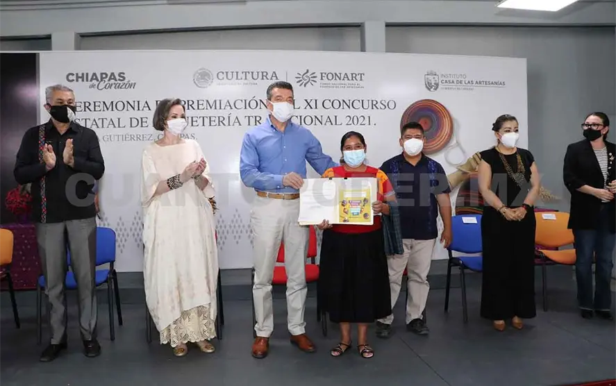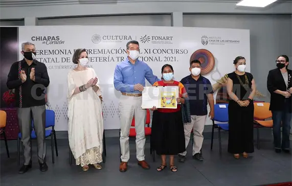 Estuvieron presentes: el encargado de la Secretaría de Economía y del Trabajo, Carlos Alberto Salazar Estrada; la directora general del Consejo Estatal para las Culturas y las Artes de Chiapas, Maritsa Concepción Maranto Zepeda; el presidente del Jurado Calificador, Roberto Ramos Maza; así como artesanas y artesanos ganadores de las diferentes categorías de este concurso.