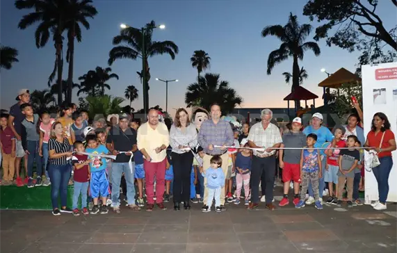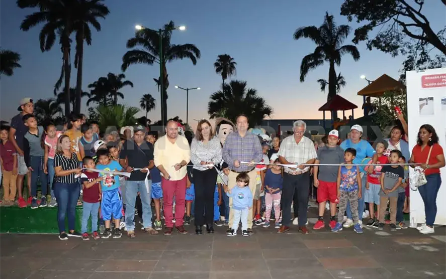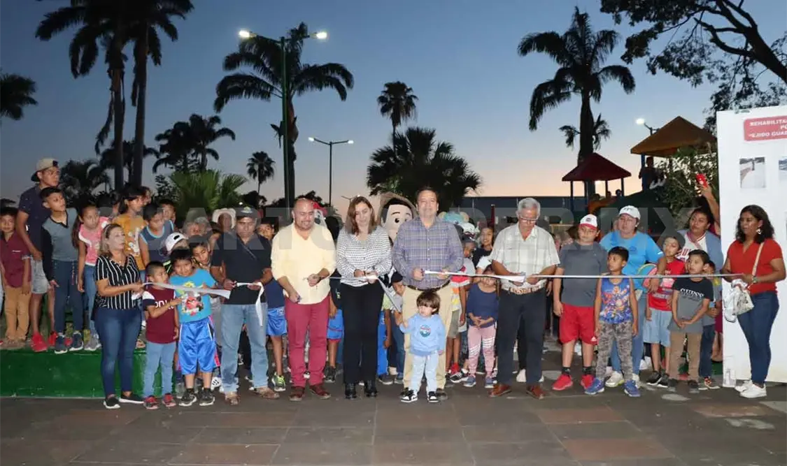 El alcalde Mariano Rosales Zuarth, acompañado por su esposa Margarita Sarmiento, su hijo Mariano, autoridades ejidales y familias, hizo entrega del parque del ejido Guadalupe Victoria tras su remodelación.