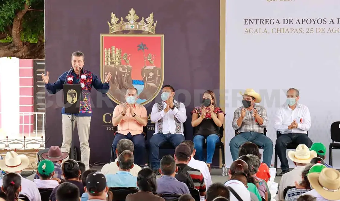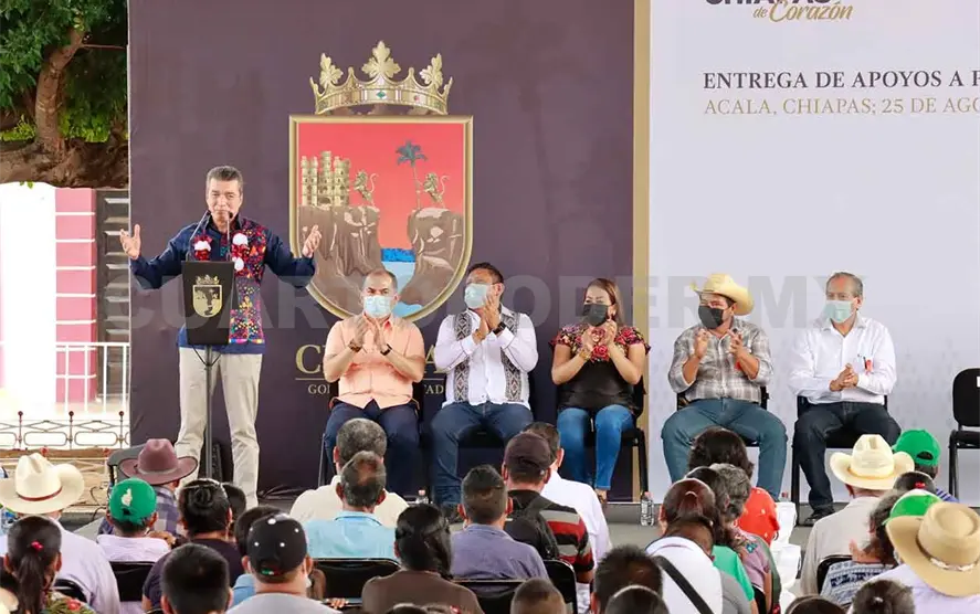 Durante la entrega de apoyos agrícolas a productores de Acala, el gobernador Rutilio Escandón Cadenas destacó el respaldo del presidente Andrés Manuel López Obrador al campo chiapaneco mediante la distribución de fertilizantes a productores con menos de cinco hectáreas, lo que se suma a los beneficios que otorga el Gobierno del Estado para fortalecer a este sector, como son semillas mejoradas, molinos, insumos y árboles frutales.
