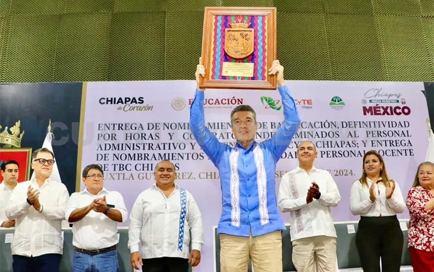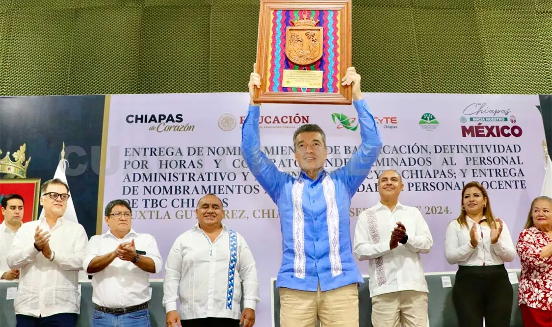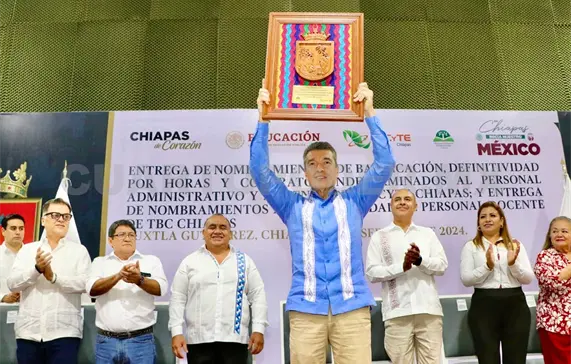 En Tuxtla Gutiérrez, el gobernador Rutilio Escandón Cadenas encabezó la entrega de nombramientos de basificación, de definitividad por horas y de contratos indeterminados, así como cambios de adscripción al personal administrativo y docente del Colegio de Estudios Científicos y Tecnológicos del Estado de Chiapas (Cecyte Chiapas), además de nombramientos al personal docente de Telebachillerato Comunitario (TBC Chiapas).