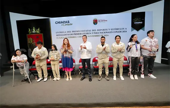 El gobernador Rutilio Escandón Cadenas entregó el Premio Estatal del Deporte (PED) y estímulos a medallistas de Primera Fuerza y Paranacionales Conade 2024, a quienes reconoció por traer grandes resultados para Chiapas y ser ejemplo para las futuras generaciones.