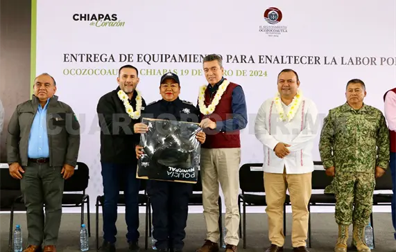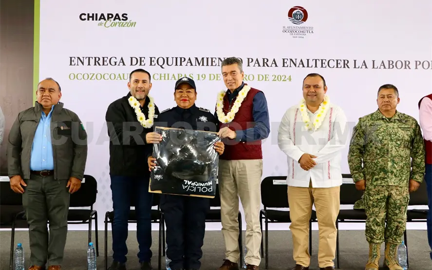 En la entrega de patrullas, motopatrullas, uniformes y equipamiento a la Policía Municipal de Ocozocoautla, el gobernador Rutilio Escandón Cadenas sostuvo que en Chiapas se trabaja en unidad y se prioriza la inversión en materia de seguridad, porque además de proporcionar paz, tranquilidad y bienestar, constituye el primer paso para consolidar el progreso y crecimiento del índice de desarrollo humano de los pueblos.