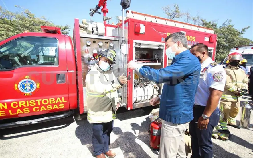 Durante la entrega de equipamiento a cuerpos de Bomberos de Chiapas y de distintas entidades del país, donado por bomberos de Escocia, Reino Unido, a través de la Asociación Internacional de Fuego y Rescate (IFRA, por sus siglas en inglés), el gobernador Rutilio Escandón Cadenas agradeció este acto de solidaridad, nobleza y humanidad, que fortalece la protección de las bomberas y bomberos, quienes arriesgan hasta su propia vida para cuidar la integridad y el patrimonio de las personas.