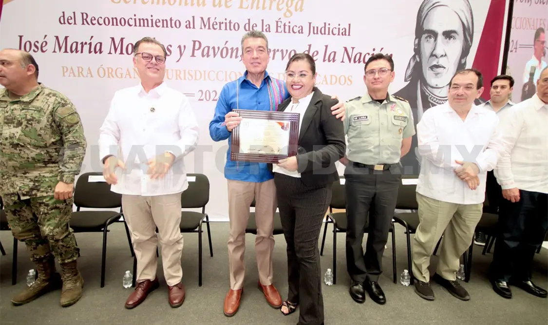 En la ceremonia de entrega del Reconocimiento al Mérito de la Ética Judicial, José María Morelos y Pavón, Siervo de la Nación 2024, el gobernador Rutilio Escandón Cadenas destacó que este galardón enaltece la labor responsable, comprometida, profesional y humanista, con respeto de los derechos humanos y con perspectiva de género de las trabajadoras y los trabajadores del Poder Judicial del Estado (PJE) a través de los órganos jurisdiccionales.