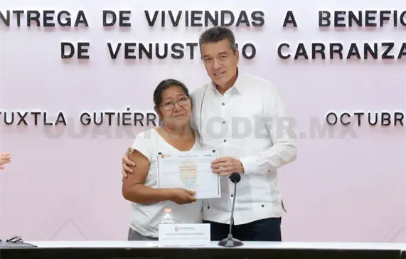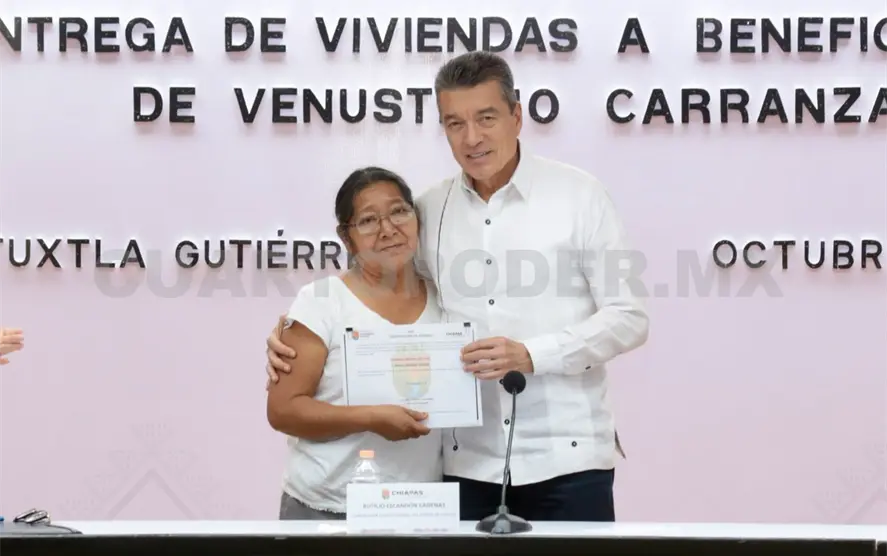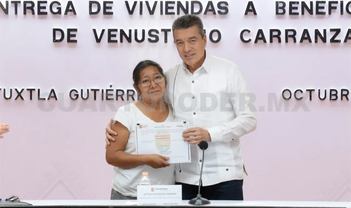 En la entrega de viviendas a familias del municipio de Venustiano Carranza, el gobernador Rutilio Escandón Cadenas destacó que este acto no solo significa garantizar un techo de material, sino que es un símbolo del trabajo a favor de la unión, la dignidad, la seguridad, la justicia y el bienestar de quienes durante muchos años lucharon para acceder a este derecho humano.