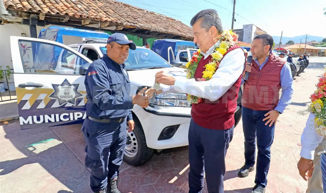 El gobernador Rutilio Escandón Cadenas entregó patrullas, motopatrullas, equipamiento y uniformes a las corporaciones policiales de los municipios de Soyaló, Ixtapa, Bochil, Jitotol, Rincón Chamula, Tapalapa, Rayón y Amatán, donde destacó que, ahora más que nunca, se invierte para que las y los policías cuenten con todas las herramientas y una mejor preparación profesional para garantizar la paz, la tranquilidad, el bienestar y el Estado de derecho.