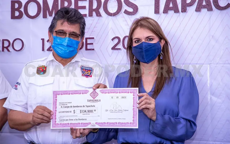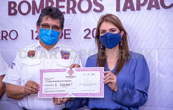 La presidenta municipal, Ro2sa Irene Urbina Castañeda, hizo entrega al Patronato de Bomberos de Tapachula, de dos cheques por un monto total de 422 mil 854 pesos de las aportaciones ciudadanas a través del Comité de Agua Potable y Alcantarillado (Coapatap), así como otro por 134 mil 900 pesos, de lo recaudado en la carrera “Por Amor a los Bomberos”.