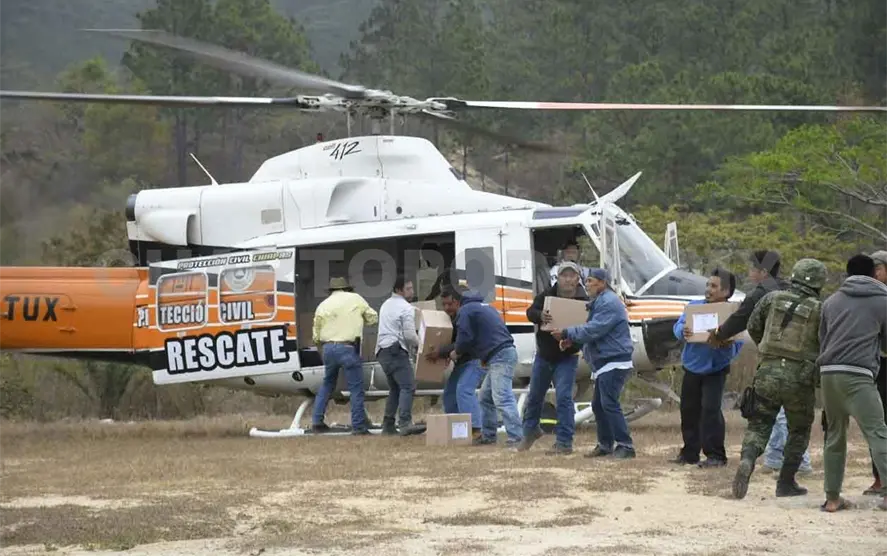 Vía aérea, la Secretaría de Protección Civil de Chiapas distribuyó 300 paquetes en beneficio de igual número de familias, cuyo contenido son comestibles, medicamentos básicos, leche en polvo para lactantes y productos para el aseo personal, entre otros.