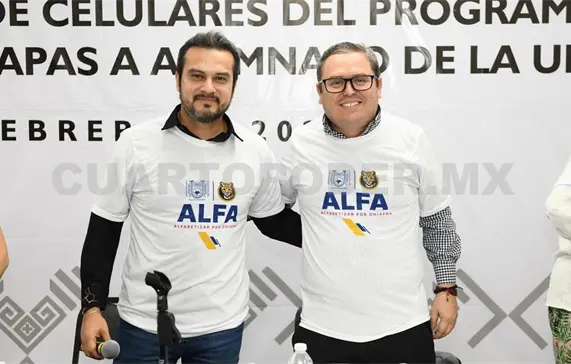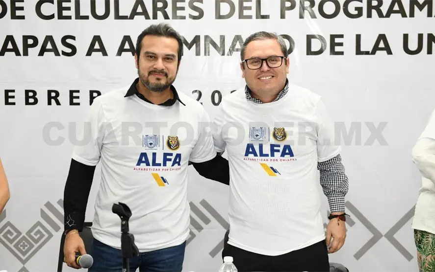 En el marco del Programa de Alfabetización “Chiapas Puede”, el secretario de Educación, Roger Adrián Mandujano Ayala y el rector Oswaldo Chacón Rojas realizaron la primera entrega de celulares a 50 jóvenes estudiantes de la Unach que se encuentran registrados como alfabetizadores.