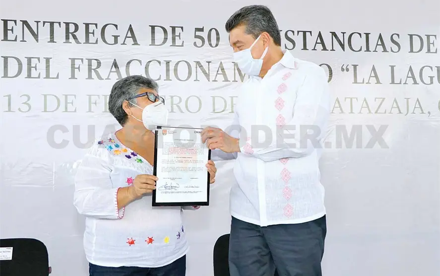 Luego de más de 20 años de espera, 50 familias del Fraccionamiento “La Laguna”, del municipio de Catazajá, recibieron sus constancias de posesión de manos del gobernador Rutilio Escandón Cadenas, quien les manifestó que este documento les da certeza y confianza sobre un bien que ahora es legalmente su patrimonio y del que nadie podrá despojarlos.