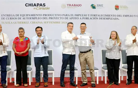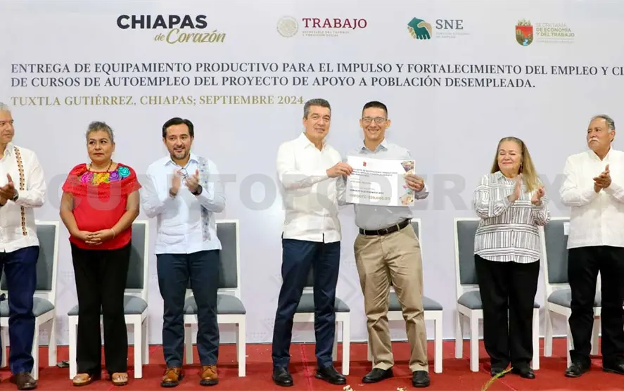En Tuxtla Gutiérrez, el gobernador Rutilio Escandón Cadenas hizo entrega de equipamiento productivo para el impulso y fortalecimiento del empleo en beneficio de 197 chiapanecas y chiapanecos que se encuentran en situación de desempaleo o subempleo, con el propósito de que inicien, fortalezcan o consoliden una actividad productiva rentable, como fuente de trabajo por cuenta propia.