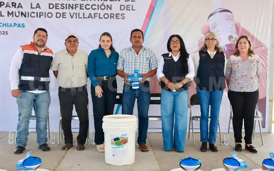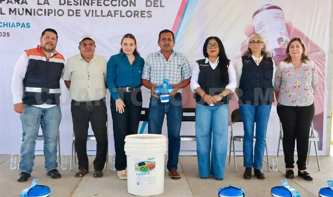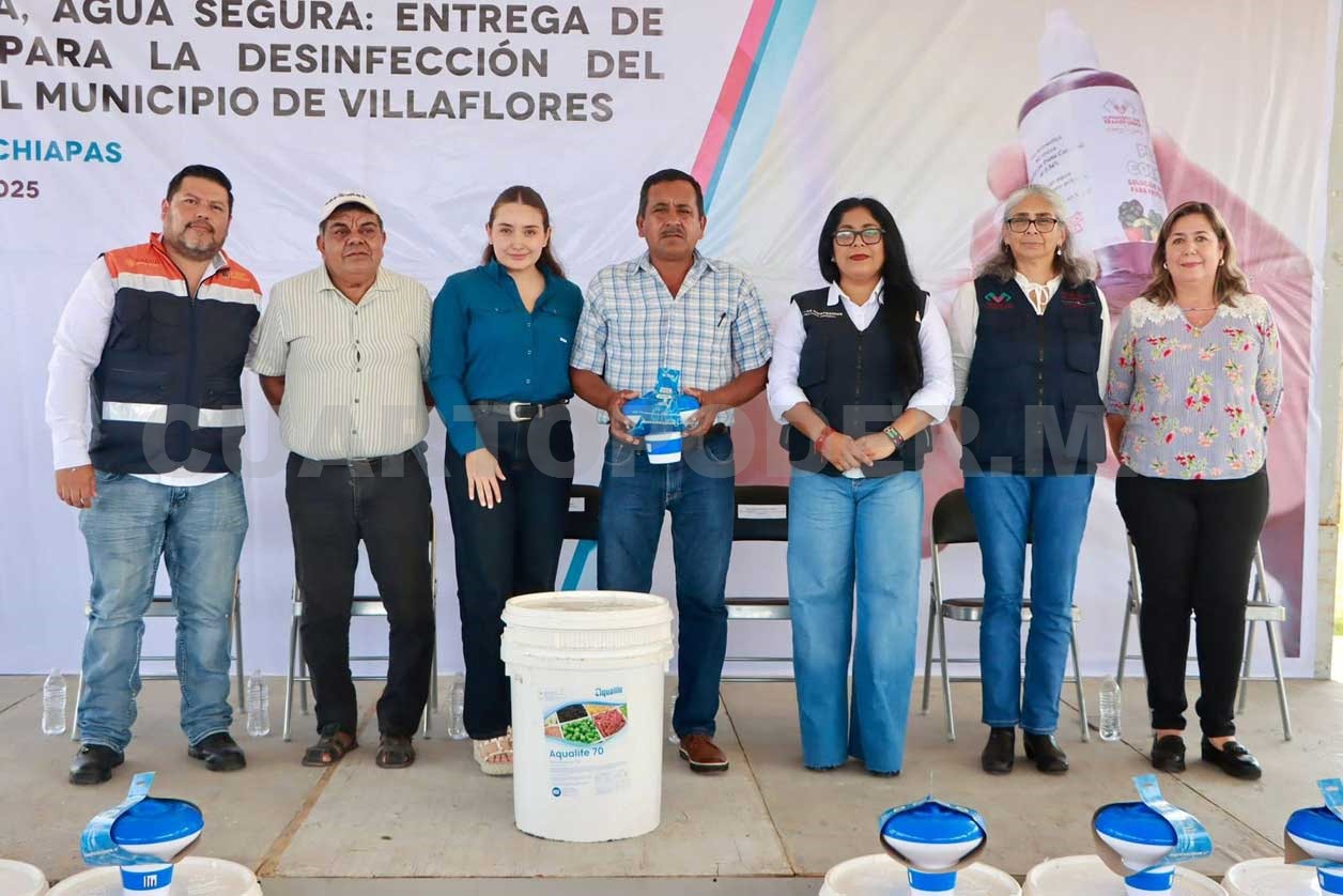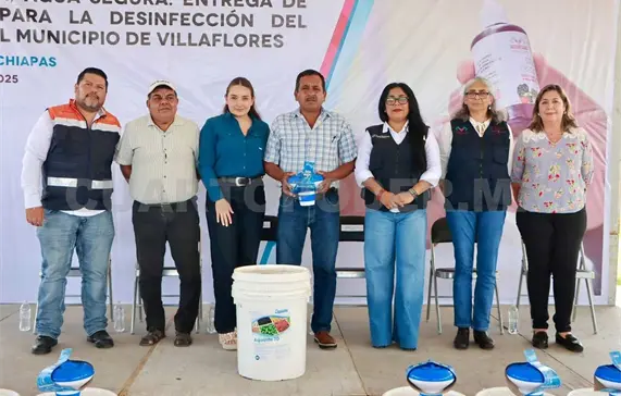 Con el acompañamiento de la directora general de la Comisión Estatal de Agua y Saneamiento (CEAS), Karina Montesinos Cárdenas, la jefa jurisdiccional Blanca Estela Valdés Urzúa, así como funcionarios estatales y municipales, la presidenta municipal de Villaflores, Valeria Rosales Sarmiento, encabezó la entrega de plata coloidal y cloro residual, para la desinfección del agua en el municipio de Villaflores, realizada en la comunidad de Joaquín Miguel Gutiérrez.