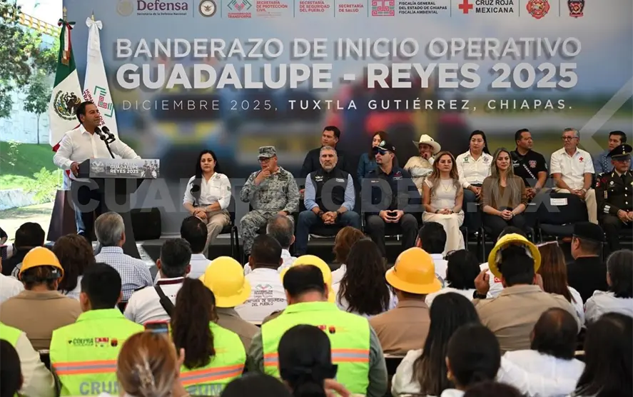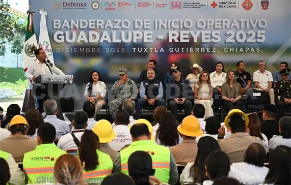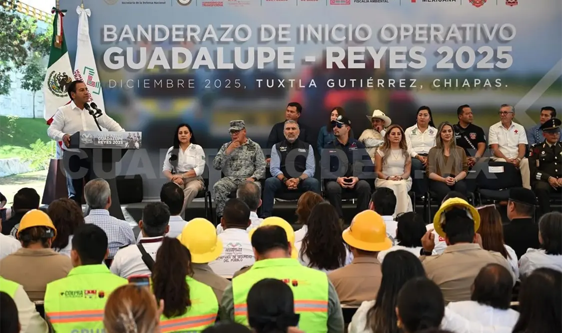En Tuxtla Gutiérrez, el gobernador Eduardo Ramírez Aguilar dio el banderazo de inicio del Operativo Guadalupe-Reyes 2025. Señaló que el propósito es reforzar la coordinación entre las autoridades de seguridad y procuración de justicia, las Fuerzas Armadas, el sector salud, así como las instituciones estatales y municipales, con el fin de garantizar la tranquilidad y el bienestar de la población ante el incremento de la movilidad y las celebraciones decembrinas.