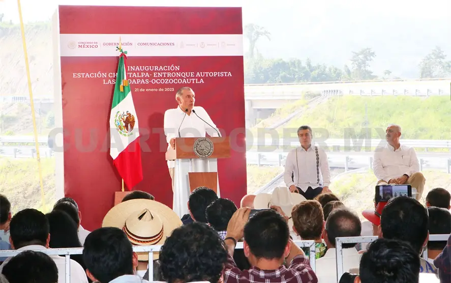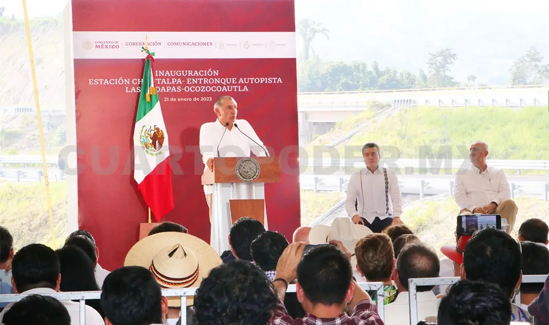 El gobernador Rutilio Escandón Cadenas acompañó al secretario de Gobernación, Adán Augusto López Hernández, quien en representación del presidente Andrés Manuel López Obrador encabezó la inauguración del tramo Estación Chontalpa-Entronque Autopista las Choapas-Ocozocoautla, un proyecto de infraestructura vial que estuvo abandonado por gobiernos anteriores y que ahora se suma a la red de caminos para mejorar la conectividad y promover el desarrollo económico, turístico, comercial y social, así como impulsar las actividades productivas de los estados de la región Sureste del país.