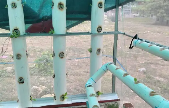 El estudiante refiere que en el huerto que construyó utiliza dos variedades de lechuga, colocadas en vasos, y estos en contenedores que hizo con tubos PVC reciclados, además de un sistema de bombeo de agua.