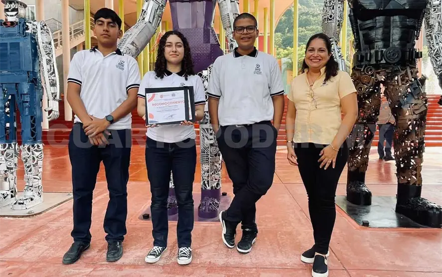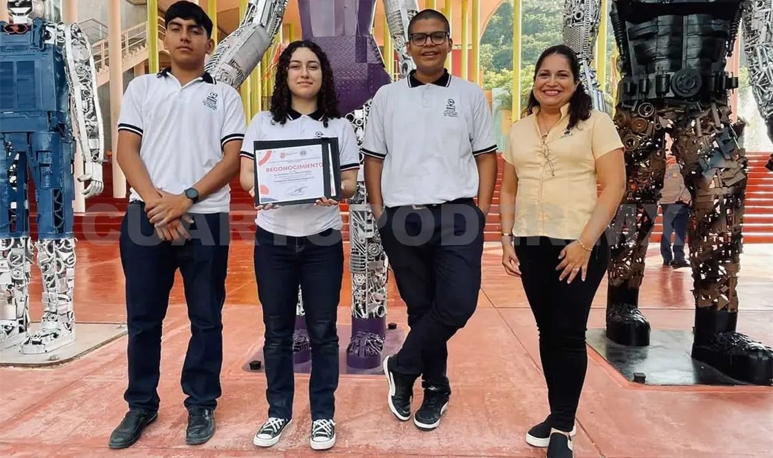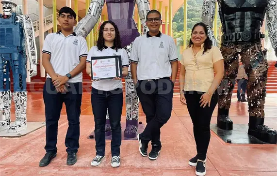 Algunos de los estudiantes que fueron premiados, que son: Ángel Monterroza Córdova, Erick Guadalupe Velázquez Méndez y Octavio Constantino Martínez, del plantel 16 Ocosingo, quienes obtuvieron el segundo lugar en el rubro Seguidor de Línea y Laberinto.