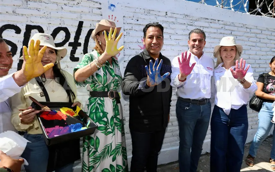 Durante la puesta en marcha del programa, mediante el cual se apoyará a migrantes que realicen actividades de limpieza en la ciudad y otras acciones de servicio social, el gobernador Ramírez Aguilar plasmó las manos en un mural elaborado por extranjeros relacionados al Humanismo que Transforma.