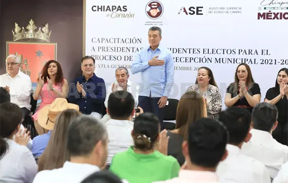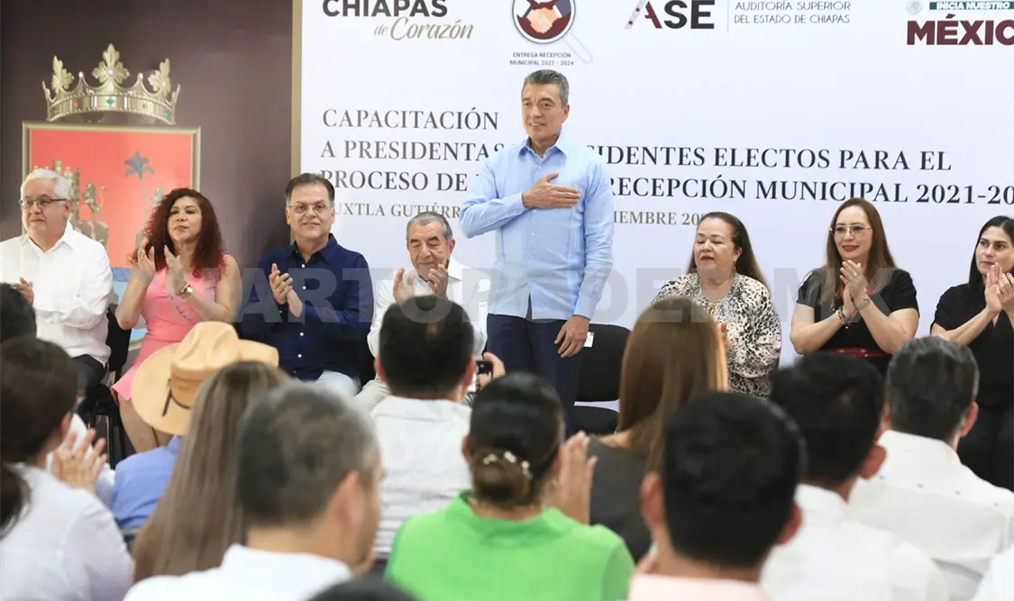 El gobernador Rutilio Escandón Cadenas inauguró la Capacitación a Presidentas y Presidentes Electos para el Proceso de Entrega-Recepción Municipal 2021-2024. Ahí subrayó la importancia de que las nuevas autoridades municipales aprovechen esta oportunidad para que tengan a su alcance los conocimientos, la guía y las herramientas necesarias para ejercer una administración eficiente y transparente.