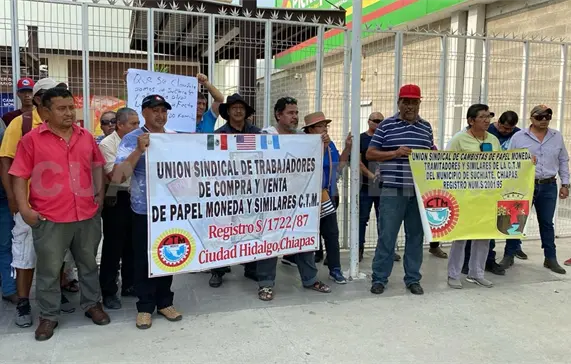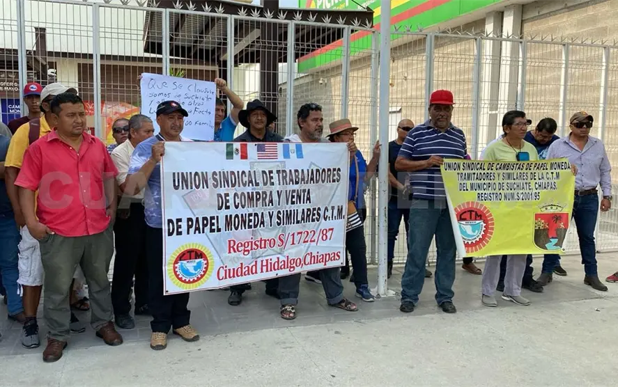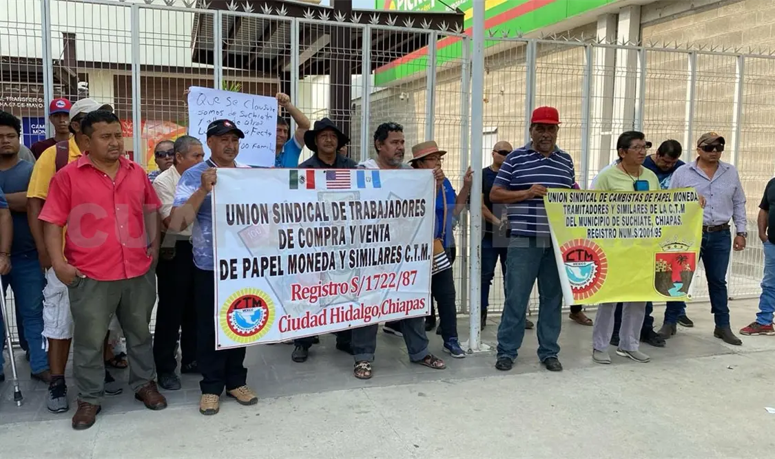 Miembros de dos agrupaciones sindicales dedicadas al cambio de papel moneda y similares de Ciudad Hidalgo, realizaron este jueves por la mañana una protesta para exigir el cierre de una casa de cambio instalada en la Vía Plaza de esta localidad.
