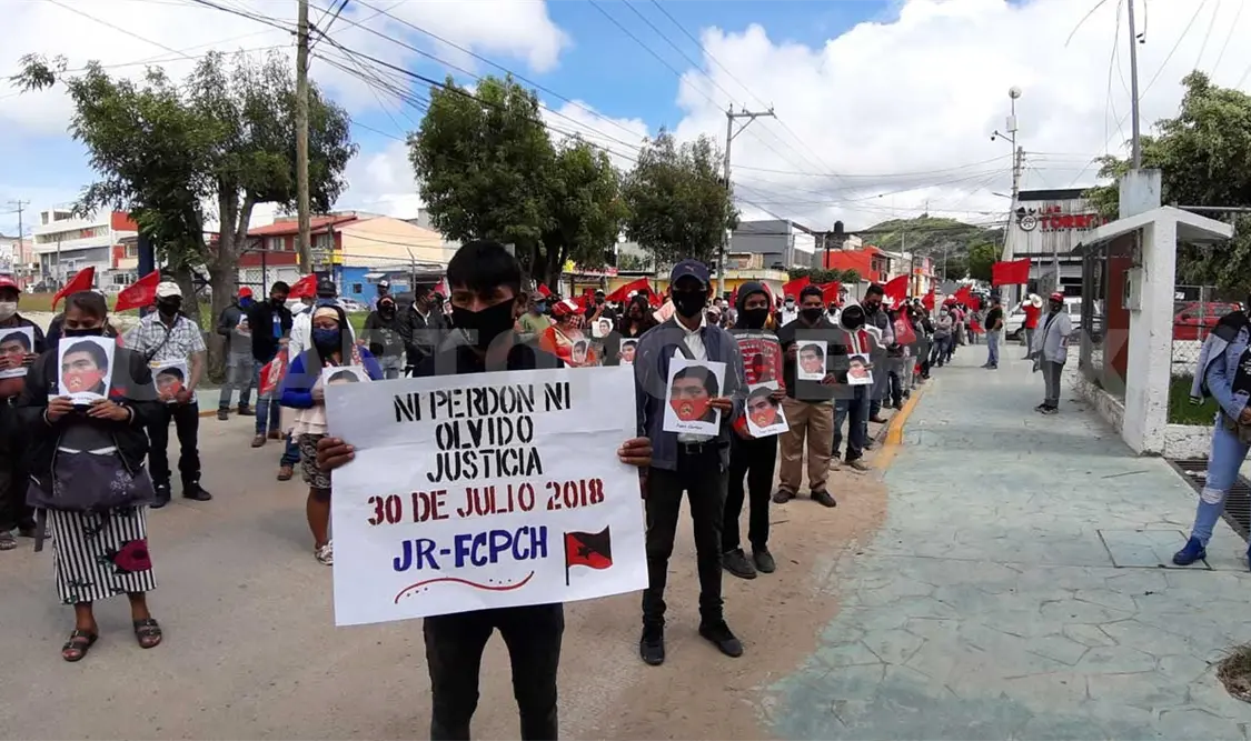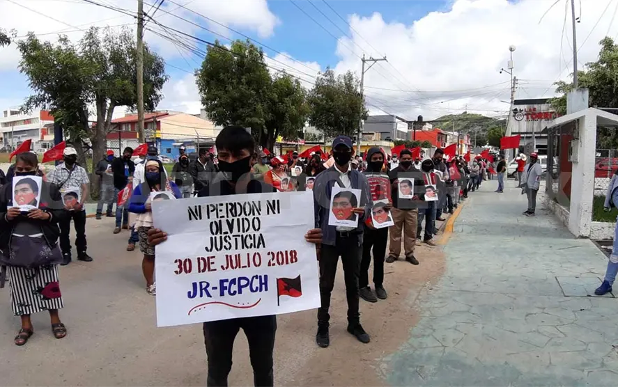 Integrantes del Frente Campesino Popular de Chiapas y de la OCEZ-UNOPII se manifestaron frente a las oficinas de la Fiscalía de Distrito Fronterizo Sierra y la Delegación de Gobierno, de la ciudad de Comitán, para exigir justicia por la masacre que se perpetró contra sus compañeros en el 2018, en donde murieron cinco personas y 43 resultaron con heridas de bala, en un desalojo fallido que ordenó el expresidente municipal Mario Antonio Guillén Domínguez junto a grupos de choque.