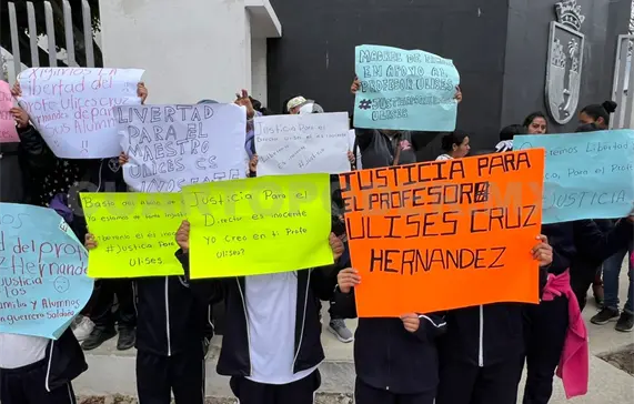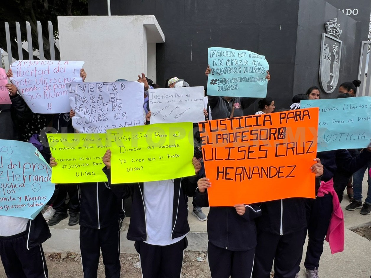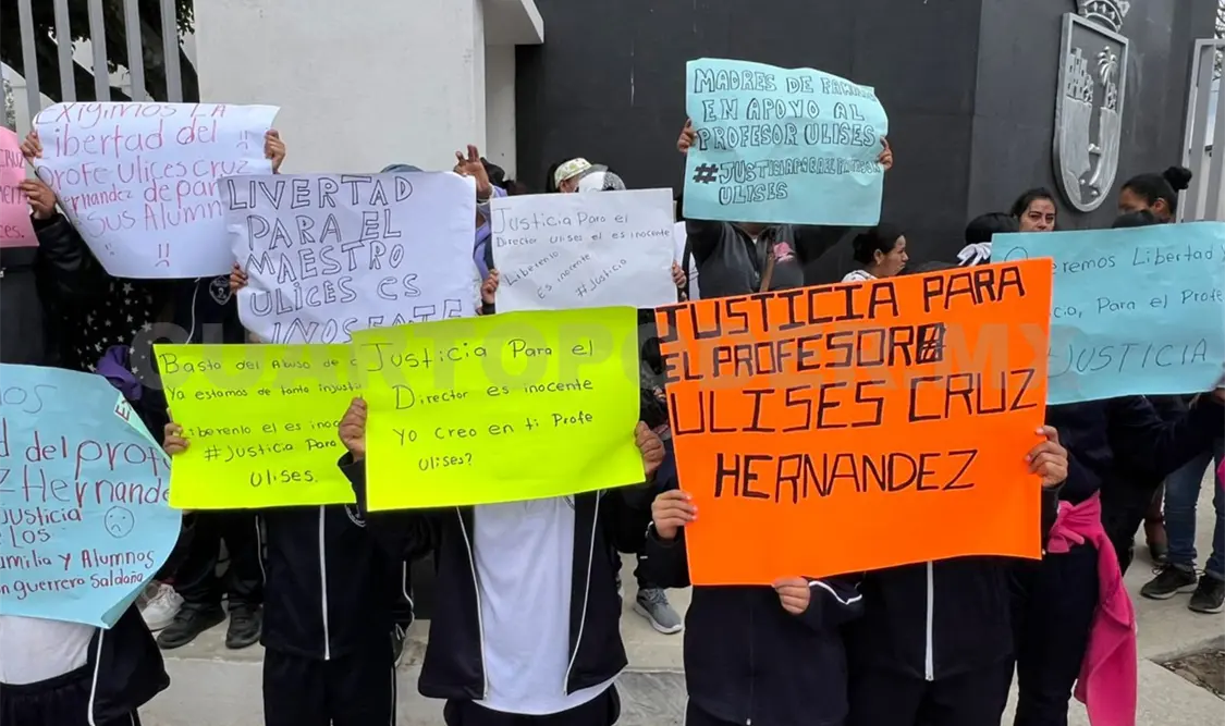 Con pancartas con las frases: “Queremos libertad y justicia para el profe Ulises #Libertad”, “Madres de familia en apoyo al profe Ulises”, “justicia para el director Ulises, él es inocente” y “liberenlo es inocente” los inconformes gritaban consignas a favor.