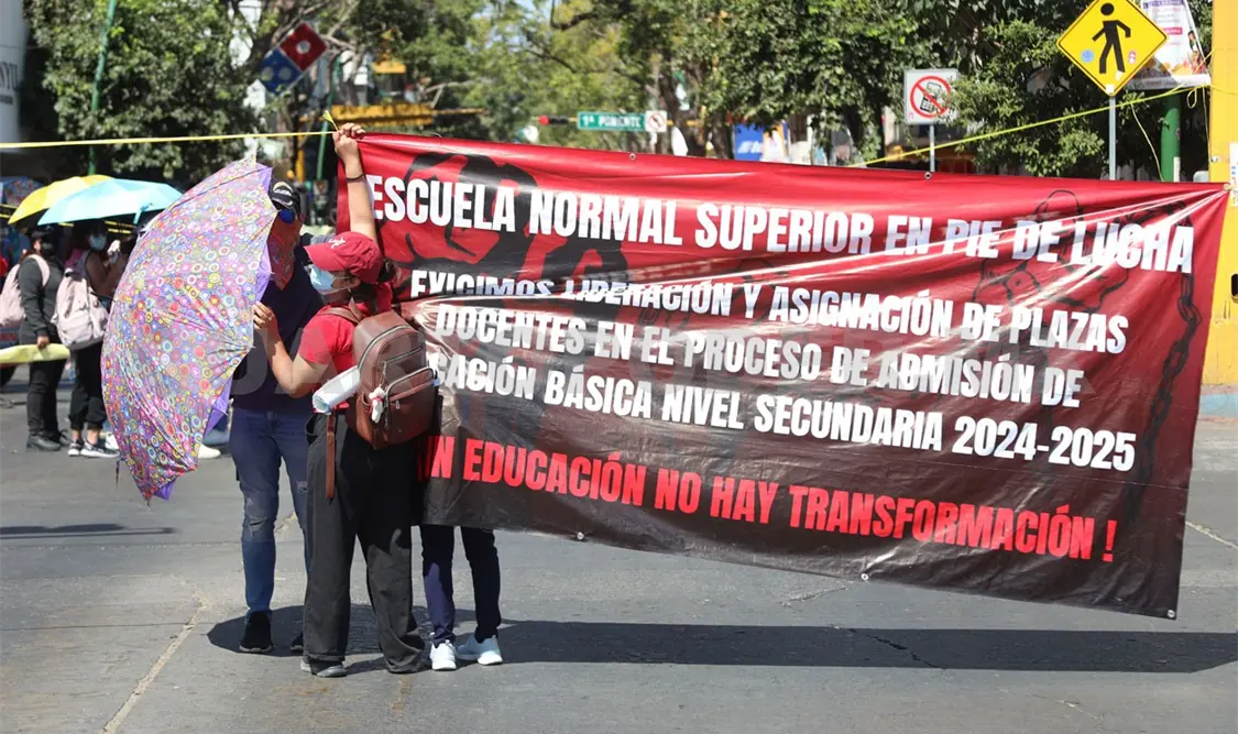 Desde temprano, este miércoles, decenas de normalistas bloquearon el cruce de la calle y avenida Central en el centro de Tuxtla Gutiérrez para pedir a las autoridades educativas se cumpla con el otorgamiento de estos espacios laborales correspondientes al ciclo 2024-2025.