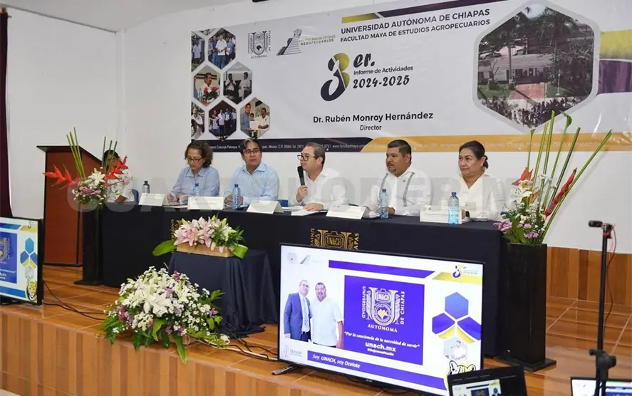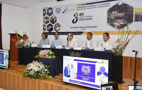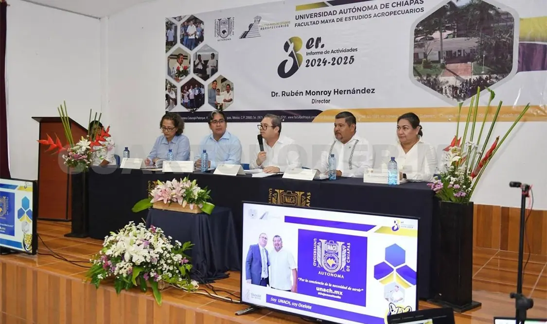 Para presentar el estado académico y administrativo que guarda la Facultad Maya de Estudios Agropecuarios de la Universidad Autónoma de Chiapas (Unach), el director Rubén Monroy Hernández rindió el Tercer Informe Anual de Actividades de la Gestión 2022–2026.