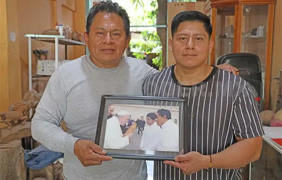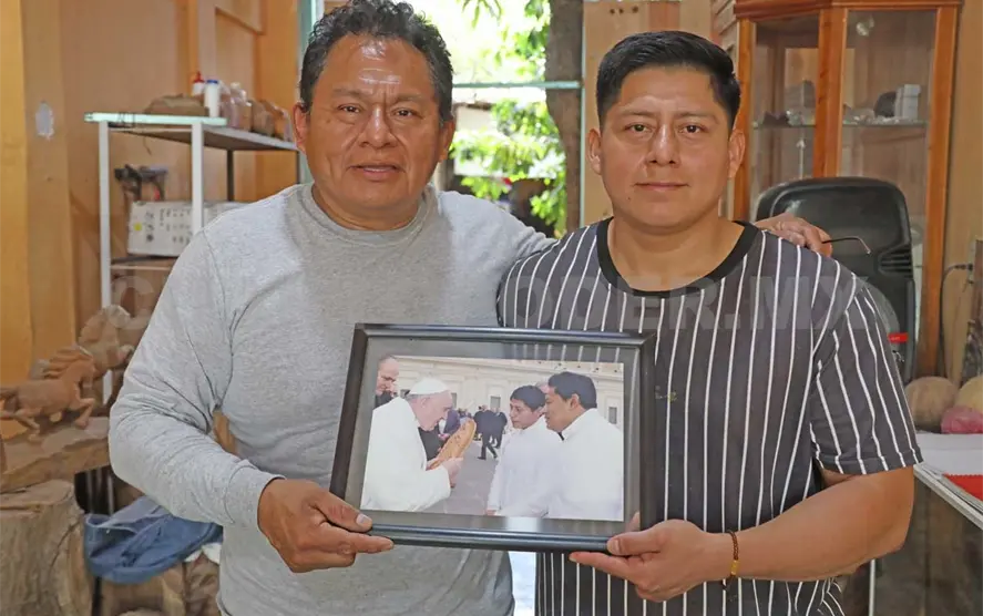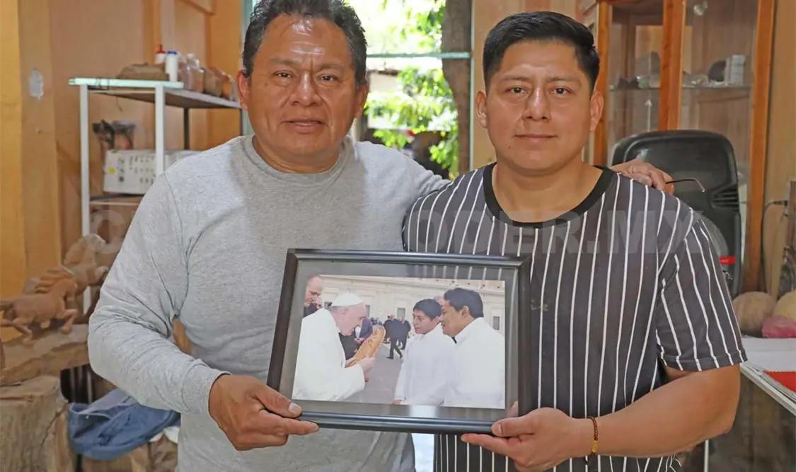 El menestral y su hijo Asunción también realizaron una virgen de Guadalupe tallada en madera de cedro, misma que entregaron y obsequiaron directamente al papa Francisco.
