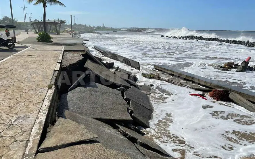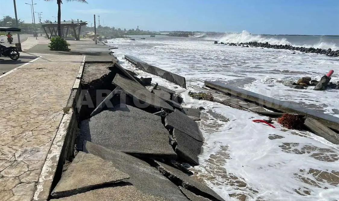 Las fuertes marejadas a causa del mar de fondo que se registra en las costas de Chiapas han causado daños en una parte del malecón de Puerto Madero, el cual fue acordonado por las autoridades.