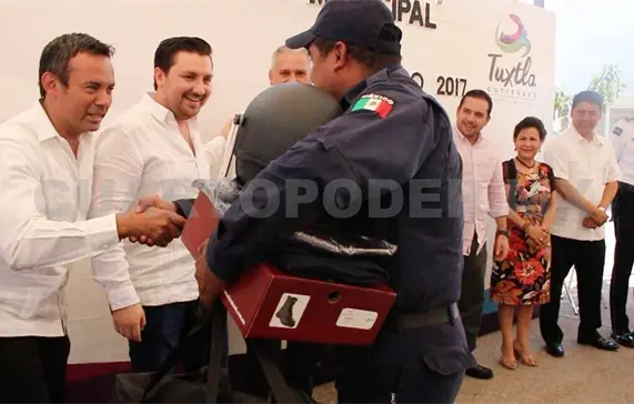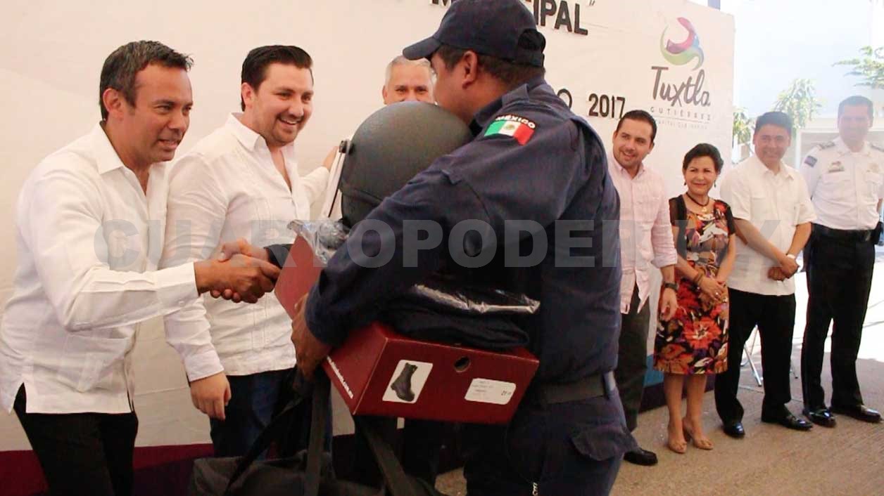 En el marco del festejo del Día del Policía, el Ayuntamiento de Tuxtla Gutiérrez conjuntamente con la Secretaría de Seguridad Pública y Tránsito Municipal entregaron 400 equipos antimotines y dos mil uniformes a oficiales de la corporación, quienes reafirmaron su compromiso de salvaguardar la integridad de los ciudadanos.