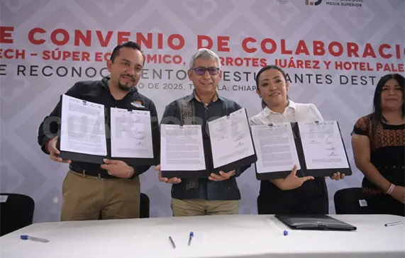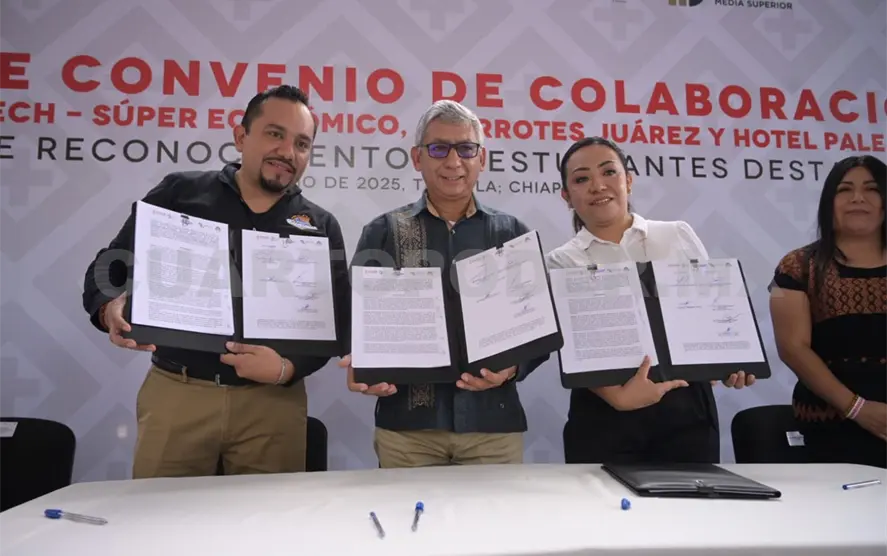 El Colegio de Estudios Científicos y Tecnológicos del Estado de Chiapas (Cecytech) formalizó la firma de convenios de colaboración de Educación Dual con las empresas Super Económico, Abarrotes Juárez y Hotel Palenque, lo que permitirá que las y los estudiantes se integren al entorno productivo mediante un modelo educativo que articula la formación académica con la experiencia laboral en contextos reales.