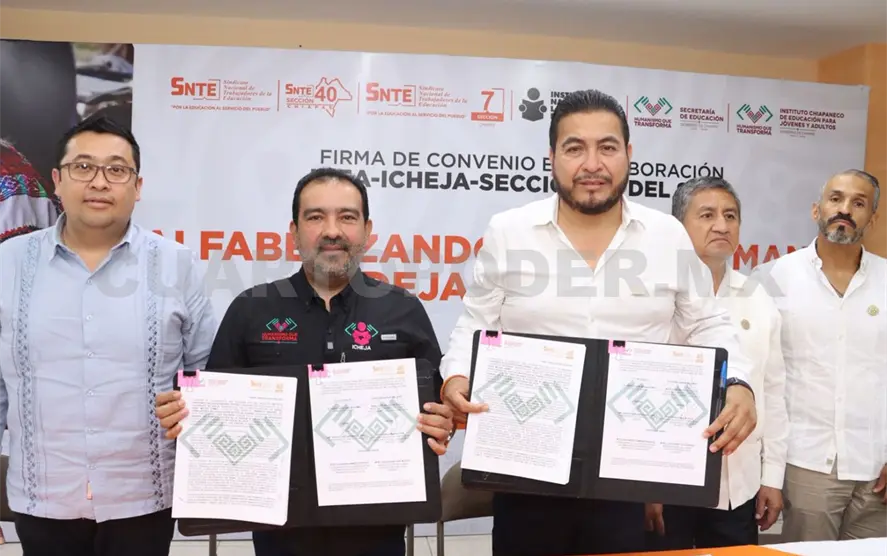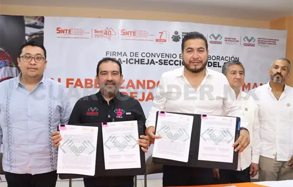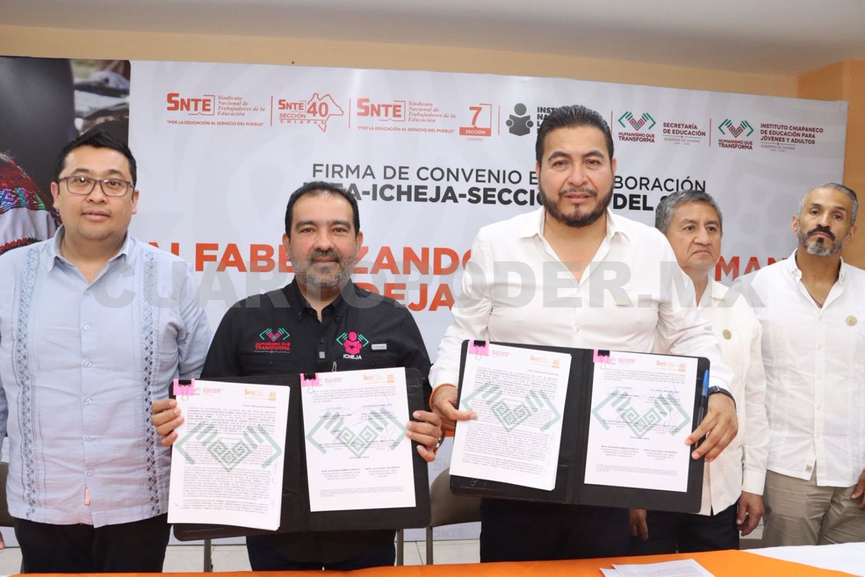 Con el firme compromiso de avanzar en la alfabetización y el fortalecimiento educativo en la entidad, el Instituto Chiapaneco de Educación para Jóvenes y Adultos (Icheja) y la Sección 40 del Sindicato Nacional de Trabajadores de la Educación (SNTE) llevaron a cabo la firma de un convenio de colaboración interinstitucional.