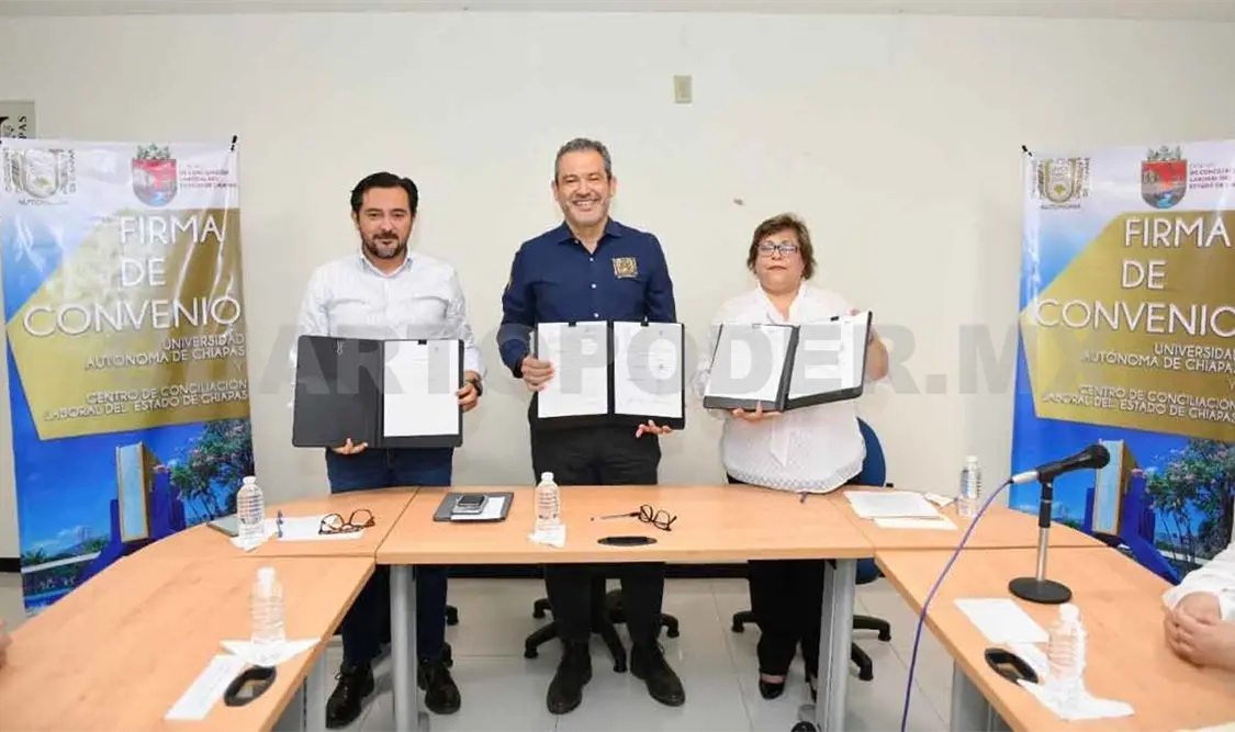 Este acuerdo, que beneficiará a estudiantes de la Facultad de Derecho, Campus III, San Cristóbal de Las Casas y las extensiones con sede en los municipios de Palenque y Tapachula, además de la Licenciatura en Derecho que imparte el Instituto de Investigaciones Jurídicas, también contempla la realización de cursos-talleres y diplomados en materia de conciliación y mediación en materia laboral.
